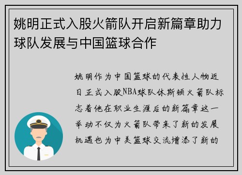 姚明正式入股火箭队开启新篇章助力球队发展与中国篮球合作